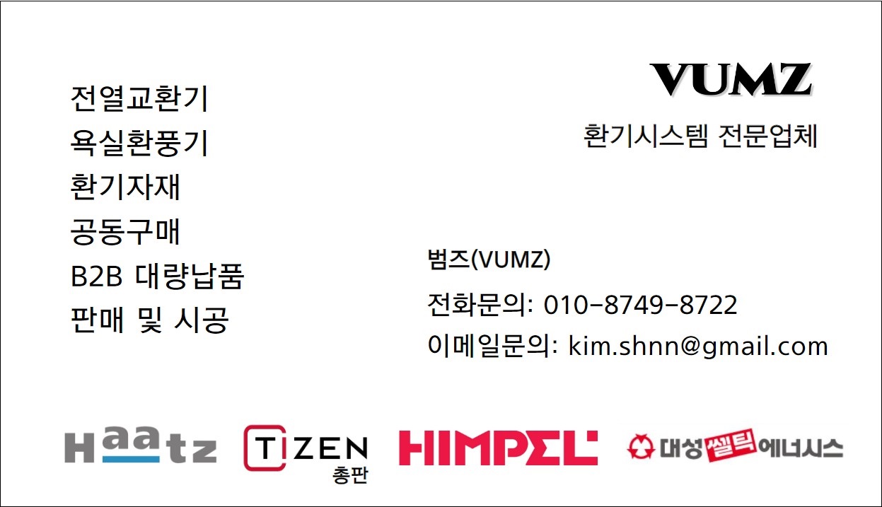 범즈(VUMZ)는 힘펠 전열교환기 뿐만 아니라 하츠전열교환기, 대성쎌틱전열교환기, 티젠전열교환기 등 성능과 품질이 좋은 다양한 브랜드의 제품을 취급하고 있습니다. 아래의 연락처를 통해서 상담을 받으시고 건강한 실내생활을 하시기 바랍니다.
