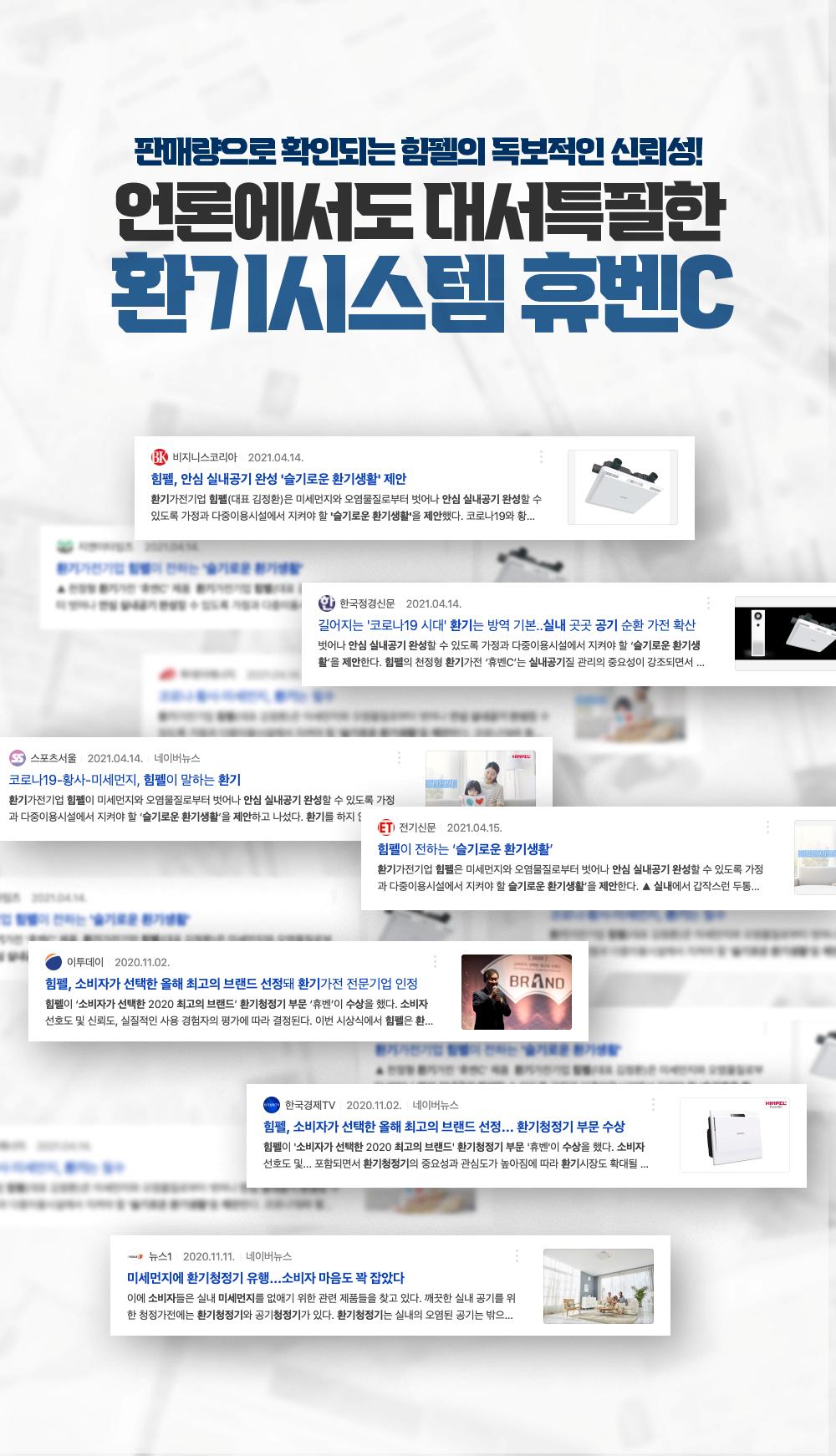 힘펠은 욕실환풍기 업계 1위입니다. 가정용 실내환기에서 오랜 시간 TOP을 유지하며 그 노하우를 축적한 업체에요. 그러한 노하우가 전열교환기에도 고스란히 이어져 오고 있습니다.