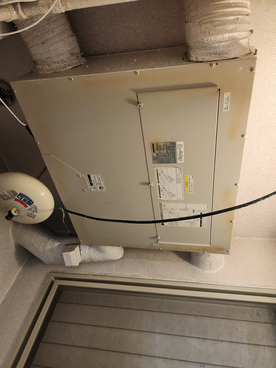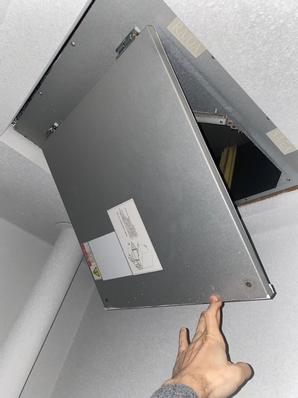 아래의 그림은 기존 전열교환기가 설치되어 있는 모습입니다. 자세히 보면 양쪽 토출구 방향으로 RA,EA 등의 문구가 적혀있는 것을 볼 수 있습니다.