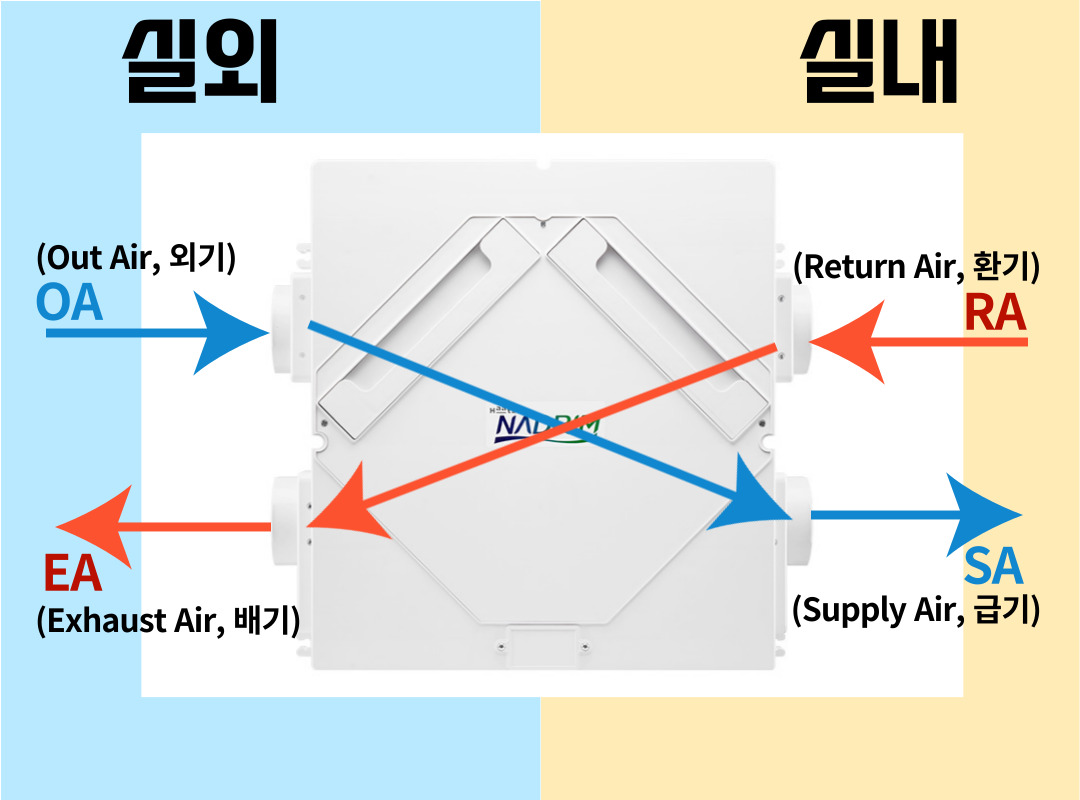 전열교환기에는 OA,EA,RA,SA라는 4개의 토출구가 있습니다. 하나의 라인은 실내로 공기를 급기하는 기능을 하고, 다른 라인은 실내의 공기를 바깥으로 배기하는 기능을 합니다. 위 그림에서 보면 푸른색의 'OA->SA'가 실내로 급기하는 라인입니다. 반면 붉은색의 'RA->EA' 라인은 실내 공기를 밖으로 빼주는 라인입니다. 각 위치는 서로 크로스로 위치하고 있습니다.