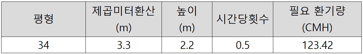 참고로 상업 시설의 경우에는 시간당 횟수를 2를 곱하면 됩니다. 그리고 높이가 아파트보다 높으니 이부분 변경하여 계산하면 됩니다. 이럴 경우 같은 평수라고 상업시설의 경우는 가정용보다 월등히 많은 환기량이 필요하게 되니, 이 점은 꼭 참고하여야 합니다.(학교의 경우는 또 다른 기준이 있으니, 이 부분도 사전에 확인해야 합니다)