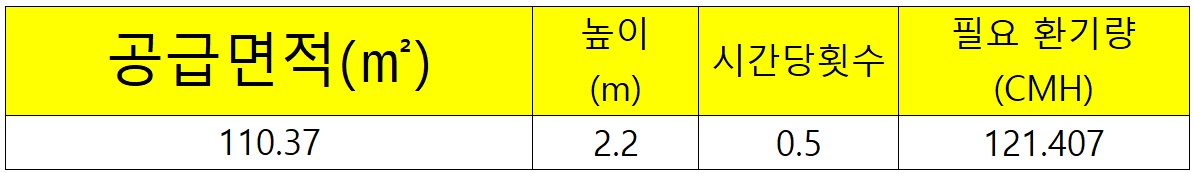 34평 아파트의 경우 제곱미터로 환산하여 높이를 곱해서 부피를 구합니다.(아파트의 경우 높이는 대략 2.2m 정도로 계산합니다) 여기에 시간당 환기 횟수인 0.5를 곱하면 필요 환기량이 나옵니다. 123.42 정도가 나오니, 넉넉하게 150CMH 이상의 전열교환기를 설치하면 됩니다. 평형 대신 제곱미터로 계산할 경우에는 높이랑 횟수만 곱하면 환기량이 계산이 됩니다. 아래는 공급면적이 110.36 제곱미터일 경우의 예시를 보여줍니다.