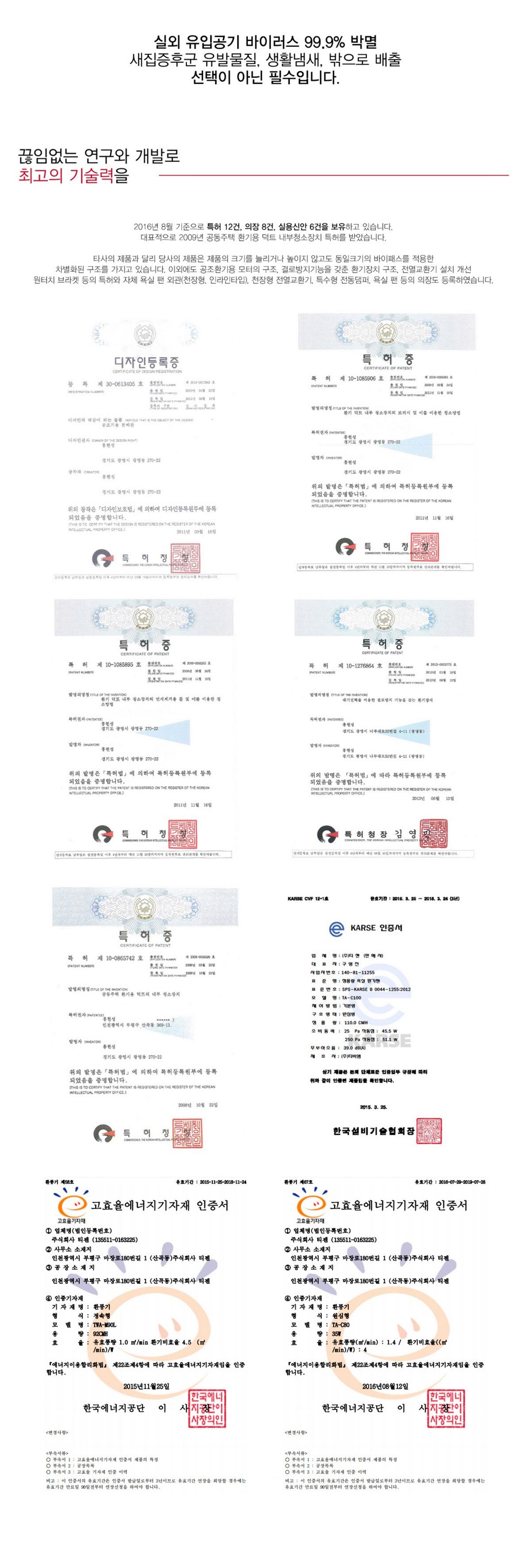 세계최초의 신기술을 접목한 시스템, 특히 2014년 천장 매립형 전열교환기로는 국내 최초로 고효율 110CMH 인증까지 휘득함은 물론, 욕실환기팬 또한 국내 최초로 90~110CMH 정풍량을 한모델로 취득하는 기술력을 보여 업계의 주목을 받고 있습니다.