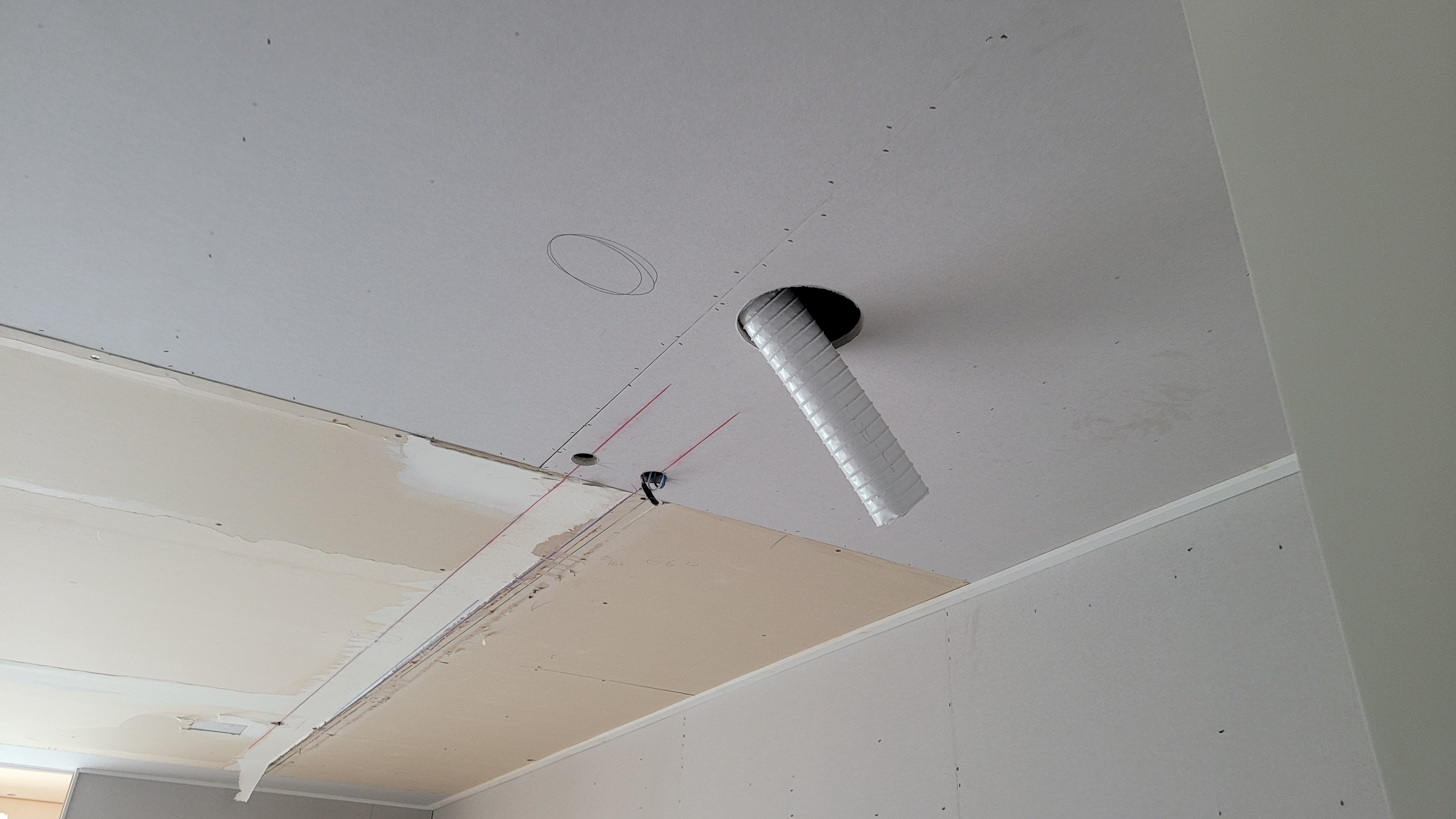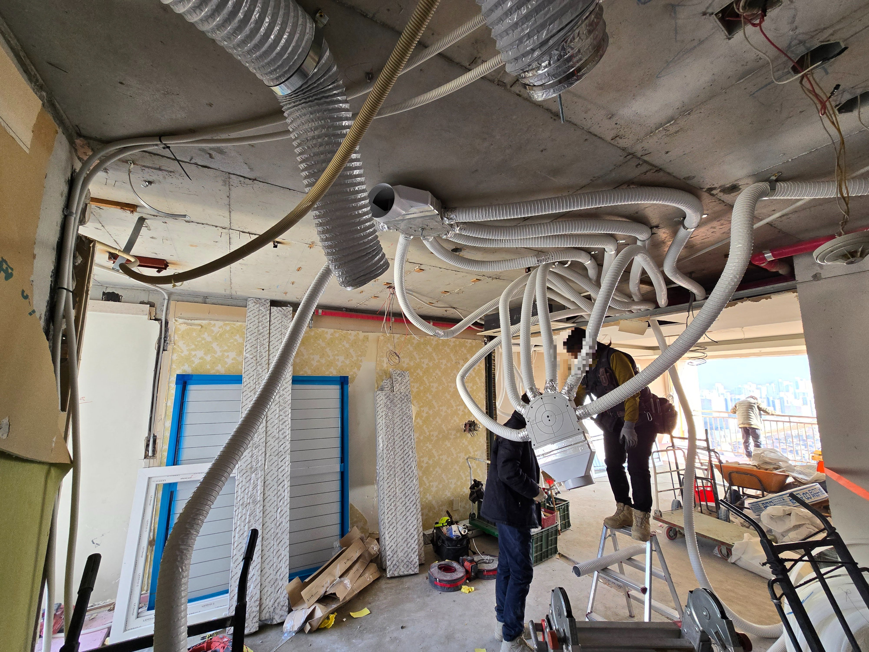 먼저 최적의 공간에 전열교환기 본체를 설치할 공간을 확보했습니다. 파크뷰 아파트는 천장고가 충분해서 작업이 수월했습니다.